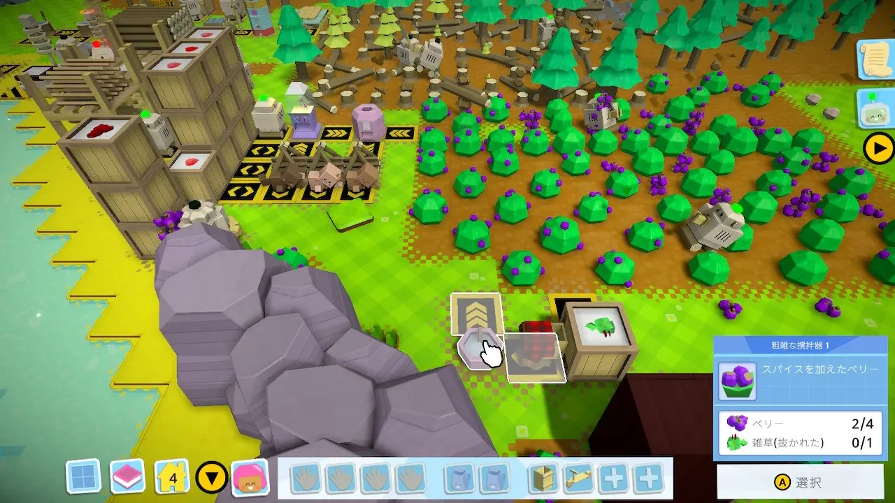 住民が移住してきたら、ボットたちに釣りや料理、建築、裁縫など多種多様な作業をプログラミングして、住民たちが充実した生活を送れるように支えていきましょう。